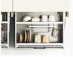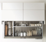 スイッチを軽く押すだけで吊戸棚の収納スペースが自動昇降