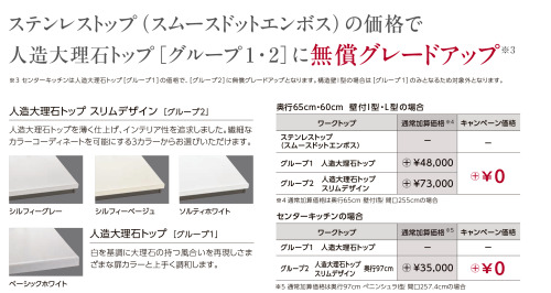 リシェルSIの場合、ワークトップ「グループ1」の価格で人造大理石トップ「グループ2」無償グレードアップ
