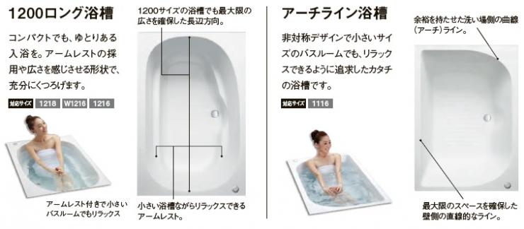 入浴スタイルに合わせて選べる浴槽形状。サイズによってお選びいただける浴槽も変わりますので、下記画像よりご確認ください。