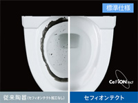 自動で便器にミストをふきつけて水のクッションを作り、汚れをつきにくくします。「セフィオンテクト」は水に馴染みやすい性質(親水性)があるので「プレミスト」の細かい水が「セフィオンテクト」に付くと、水が表面に広がって汚れが付着しにくくなります。