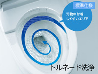 渦を巻くようなトルネード洗浄が、少ない水で効率的に洗浄します。汚物が付着しやすい便器後方に勢いよく水が当たるので、汚れをしっかり洗い流します。また便器正面から吐水口が見えないので、すっきりとした見た目を実現します。