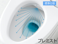 自動で便器にミストをふきつけて水のクッションを作り、汚れをつきにくくします。「セフィオンテクト」は水に馴染みやすい性質(親水性)があるので「プレミスト」の細かい水が「セフィオンテクト」に付くと、水が表面に広がって汚れが付着しにくくなります。
